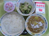 昨日から中学校1年生、今日から小学校1年生の給食が始まりました!今日はお祝い献立です。給食のカレーのおいしさのひけつは、大きな鍋でじっくりと煮ることです。一度に約160人分の給食を、調理員さんが心を込めて作ってくださっています。楽しく給食時間を過ごしましょう(^^)