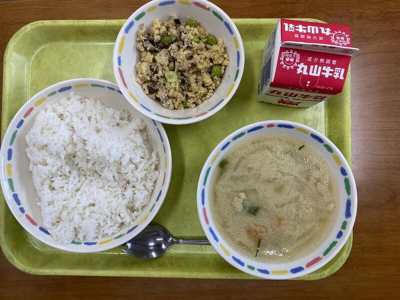 ひき肉と豆のカレーには、ひよこ豆を使いました。ひよこ豆を含む豆類には、体の筋肉や血を作ったり、体を丈夫にするたんぱく質や、お腹の中をきれいにする働きの食物繊維を多く含んでいます。給食でも豆類をよく使っています。