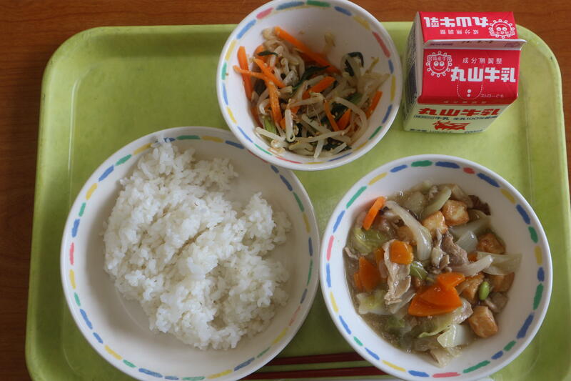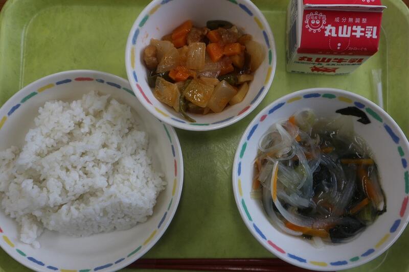 ひき肉と豆のカレーには、ひよこ豆を使いました。ひよこ豆を含む豆類には、体の筋肉や血を作ったり、体を丈夫にするたんぱく質や、お腹の中をきれいにする働きの食物繊維を多く含んでいます。給食でも豆類をよく使っています。