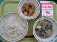 みぞれ汁とはすりおろした大根を入れた汁のことで、冬場の空から降る「みぞれ」に見立てた名前です。今日は普段の給食にはあまり使わない「三つ葉」や「白玉もち」も使いました。