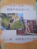 今日は諸塚学校給食の日です。今回は年に1回のジビエの提供ということで、いのしし肉と村産の野菜をたくさん使った「しし鍋」を出しました。