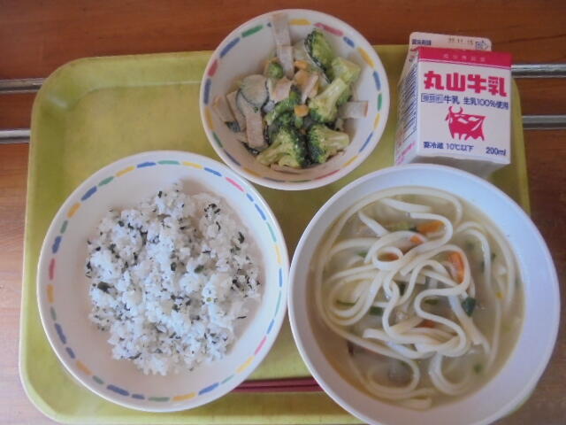 うどんだけではエネルギーが足りいので、生徒たちの好きなわかめごはんもつけました。