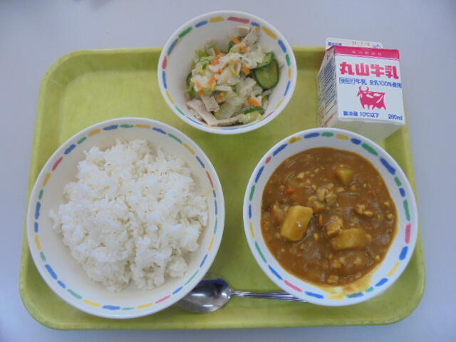 ひき肉と豆のカレーには、ひよこ豆を使いました。ひよこ豆を含む豆類には、体の筋肉や血を作ったり、体を丈夫にするたんぱく質や、お腹の中をきれいにする働きの食物繊維を多く含んでいます。給食でも豆類をよく使っています。