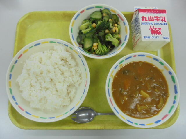 ひき肉と豆のカレーには、ひよこ豆を使いました。ひよこ豆を含む豆類には、体の筋肉や血を作ったり、体を丈夫にするたんぱく質や、お腹の中をきれいにする働きの食物繊維を多く含んでいます。給食でも豆類をよく使っています。