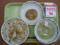 ひき肉と豆のカレーには、ひよこ豆を使いました。ひよこ豆を含む豆類には、体の筋肉や血を作ったり、体を丈夫にするたんぱく質や、お腹の中をきれいにする働きの食物繊維を多く含んでいます。給食でも豆類をよく使っています。