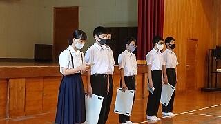 6月30日(水)に生徒集会がありました。生徒会長の柊平さんが、生徒総会で決まったハッピーボランティア(校内ボランティア活動)への協力のお礼や目安箱への意見に対してのお礼の言葉がありました。また、「メリハリのある行動」の振り返りのことなど、生徒会の方針を示しました。最後に、体育大会に向けて、みんなで団結していきましょうと語りかけました。生活委員会、学習委員会、保健委員会から、それぞれ中央委員会の報告があり、2学期の大きな行事に向けても、取組の方針が示されました。