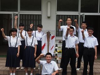 本日、実際に走った聖火ランナーのトーチが本校にやって来ました。今回の東京オリンピック・パラリンピックの聖火ランナーとして、本校卒業生の福田翔さん(れいなさんの兄)が聖火をつなげました。その時のトーチを諸塚中学校の生徒の皆さんに披露していただきました。手に持つと見た目より軽く、デザインもとても美しいです。貴重なトーチを間近で見させていただき感謝しています。翔先輩ありがとうございました。生徒全員で写真撮影をしました。今回は代表で3年生の写真を載せます。