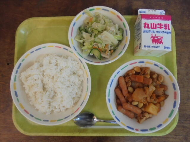 今日は不足しがちな大豆やいもが食べられるポークビーンズでした。