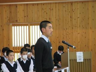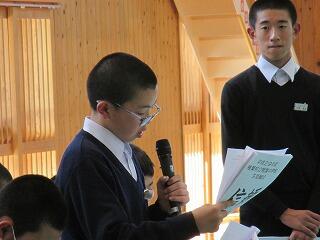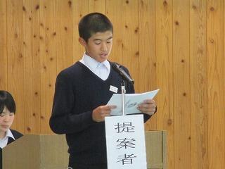 今年度の生徒会目標である「相手を尊重し、常に物事を前向きに考えられる生徒」になるために、学級で討議した内容を発表しました。