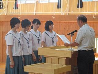 始業式では、各学年と生徒会執行部の代表の4名が新学期の抱負を述べました。