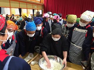 尾向小学校で毎年行われている焼畑体験です。今回は、そばの実から石臼でそば粉にして実際にそばを作る体験をしました。そばをこねたりするのは大変でした。
