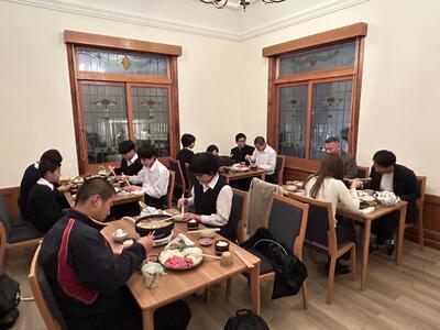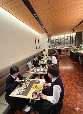 京都市内自主研修が終わり、全員清水寺近くに集合しました。今夜の夕食は、すき焼き!おなかいっぱい食べて、また電車で大阪まで帰ります。