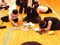 これまでの学習のなかでの制作物がたくさん掲示されたいつもとは雰囲気の違う体育館になりました。