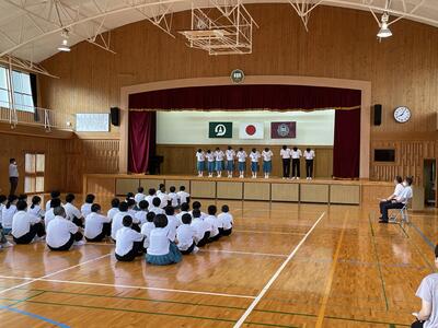 全校集会では東臼杵地区中学校体育大会の表彰が行われました。