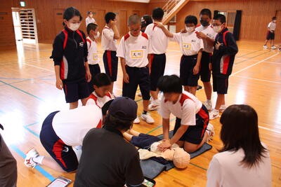 各学年に分かれて心肺蘇生法の体験を行い、「もしもの時に備える」時間になりました。