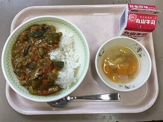 今日は夏野菜カレーとフルーツポンチという、とても楽しみなメニューだったのではないでしょうか。小学校では低学年の集合学習が行われましたね。あいにくの雨でしたが、楽しい思い出はできたでしょうか。夏野菜カレーには日頃カレーに入らないようなかぼちゃやナス、ピーマンが入っており、栄養満点でした。梅雨が明けたら毎日暑い日が続くことでしょう。夏バテ予防のためにもしっかり食事を取りましょう。