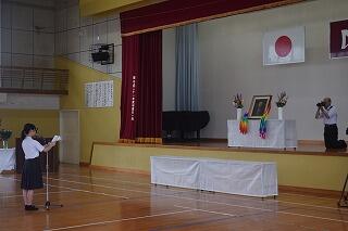 本日は、延岡大空襲慰霊祭を行いました。戦時中だった79年前の6月29日、延岡市は焼夷弾爆撃によって130名の方々が犠牲となりました。その中の一人が本校の教員だった栗田彰子先生でした。本日は、栗田彰子先生の御遺族と共に、犠牲になられた全ての方々のご冥福を祈り、命の尊さ、平和な世界をつくることの大切さを考える日となりました。