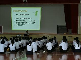 地元で働く方々を招いて授業を実施しました。来ていただいたのは、FMのべおか、住環境工房SHIDA、延岡警察署で働く方々の3名です。現在、どんな仕事をしているのかの説明を受けたり、生徒が疑問に感じたことなどを質問したりしました。日頃知らない仕事の内容などを知ることができ、生徒たちも熱心にメモをとりながら聞き入っていました。