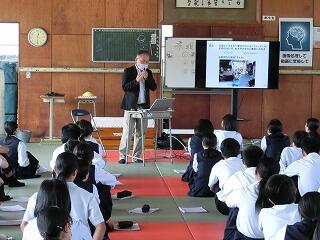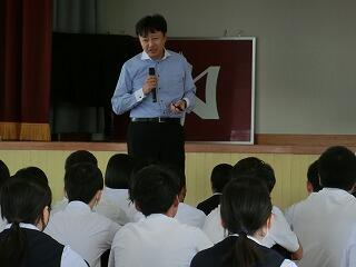 2年生で講師を招きキャリア教育講話を実施ししました。講師は、現在、延岡市でキャンプをしているラグビーチーム「静岡ブルーレヴズ」で、地域推進ユニットリーダーをされている正本さんです。
