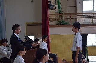 「生徒会対認式・任命式」が実施されました。まず最初に、旧生徒会役員一人一人からのあいさつがありました。あいさつでは「生徒会役員として大変だったことも多かったが、先生方や生徒のみなさんのおかげで活動できた」という「感謝」の気持ちや自分自身の成長について述べられました。発表の後に、一人一人に「感謝状」が渡されました。また、新役員には「任命証」が渡された後、新生徒会長が代表して「先輩方の築いてきた伝統を引継ぎ、さらによりよい延岡中にしていきたい」という決意の言葉も聞かれました。新役員のみなさん、1年間よろしくお願いします。