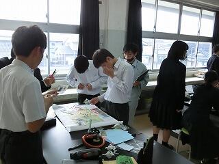 本校では、総合的な学習の時間に「地域の担い手として防災・減災について真剣に探究する生徒の育成」も目標に、各学年さまざまな取り組みを実施しています。第2学年は、地域の方々と自分の住んでいる地域を「防災マップ」を元に巡り、津波避難時に危険な箇所等について調べました。
