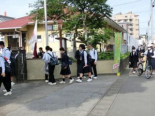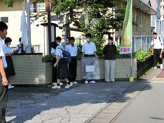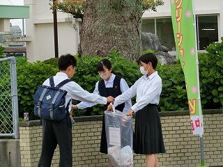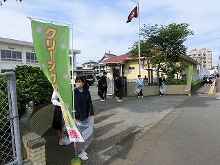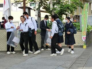 毎月1回、登校時間に通学路のゴミ拾いを実施しています。生徒会が前日に放送で呼びかけています。あいさつ運動と兼ねて月1回の恒例行事になっています。