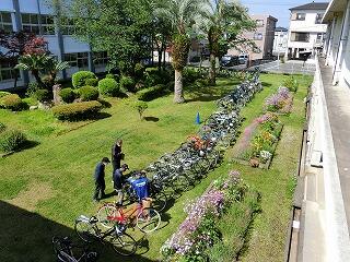 校内一斉の自転車点検です。地域の自転車組合に協力していただき実施しました。部活動の県北大会などで自転車利用の機会も増加します。ゴールデンウィークまでに修理を完了させ安全に自転車に乗りましょう。延岡警察署の方によると自転車の被害・加害者が増えているそうです。気を付けましょう。