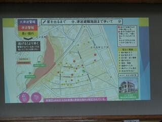 南海トラフ大地震(最大震度7、最大津波14m、津波到達時間17分)というデータをもとに、もし地震が学校で発生したら?学校外で発生したら?等、様々な事を考えさせられるお話でした。