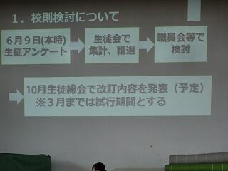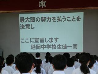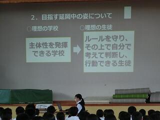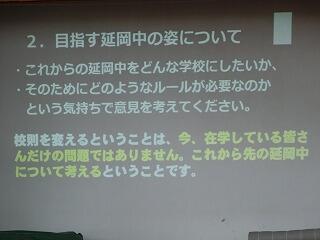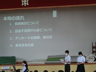 ・私たち生徒会では、この1学期に「礼儀を重んじる学校」「地域の貢献する学校」「いじめのない学校」を目指して取り組んできました。・・・また、校則に関するアンケートでは、多くの生徒の皆さんから、たくさんの意見を出していただきました。・・・2学期も全校生徒でよりよい延岡中をつくっていきましょう。