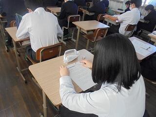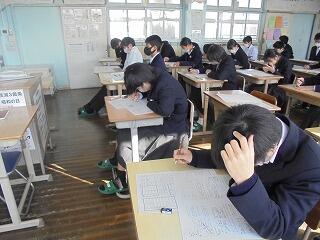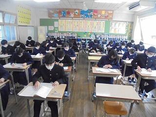 本日は火曜校時の6時間授業です。本日は県立高校一般入試1日目となっています。受験をする3年生の皆さんはこれまでの学習の成果を発揮し、志望校合格に向けて頑張ってほしいと思います。本日の生徒の皆さんの下校予定時刻は16時15分頃を予定しています。