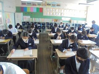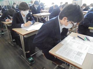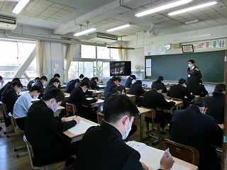 本日は特別時間割の5時間授業です。本日は第3回定期テスト、第1回論理コミュニケーション(2年生)、人権講話が予定されています。本日の生徒の皆さんの下校予定時刻は15時15分頃を予定しています。