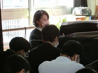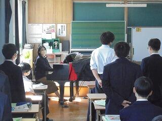 (下、本日の1年生の音楽の授業の様子です。卒業式に向けて校歌等の練習を頑張っています。)