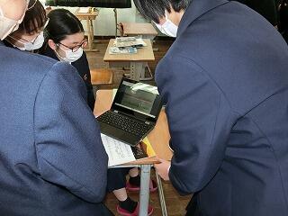 話し合った結果は、コンピュータで整理していきます。生徒同士の活発な話し合い活動が見られました。