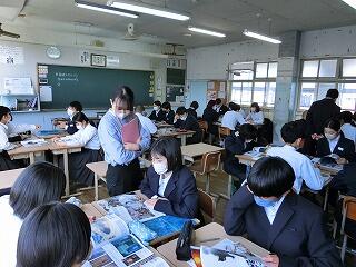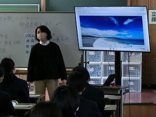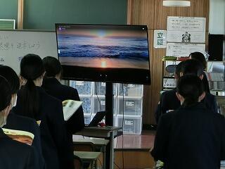 生徒からは、「楽譜は頭に入っているので、延岡の海岸を見ながら歌いたい」と提案があり、「方財海岸」の写真を見ながら歌うことになりました。