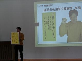 ③3名の延岡市長選に立候補するABC候補者による演説(選挙公約は)