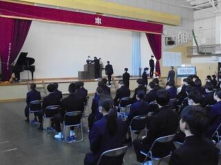 本日は修了の日となっています。本日の生徒の皆さんの下校予定時刻は11時55分頃となっています。本日の部活動は14時以降から可能となっています。明日から春休みに入ります。規則正しい生活を送り、次の学年の準備をしてほしいと思います。本年度も本校の教育活動に御理解と御協力を賜りましてありがとうございました。