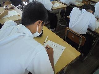 本日は特別時間割の6時間授業です。本日は第2回実力テスト(3年)、校内実力テスト(1・2年)、学級・全校専門委員会が予定されています。本日の生徒の皆さんの下校予定時刻は15時40分頃を予定しています。台風が接近しており、影響が心配されますが本日は通常どおりの授業となっています。明日以降の対応に変更がある場合には、学校メール、HPでお知らせします。