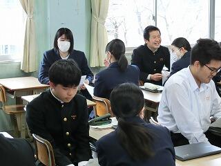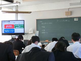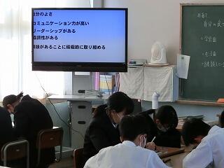 本日6時間目は1年生(学級活動)の研究授業でした。授業のねらいは、「友だちからのアドバイスによって、自分の「よさ」について気付き考える」でした。どの生徒も級友から、自分の知らなかった自分のよさを見付けてもらい、うれしそうな表情を見せていました。この経験を進路選択や職業選択にも生かして行けるといいですね。
