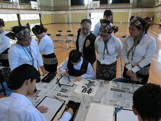 ④交流会(3年生が体育館で、延岡市について英語で紹介・習字体験・合唱披露「ふるさと」・ミャンマーの方々による踊り披露)