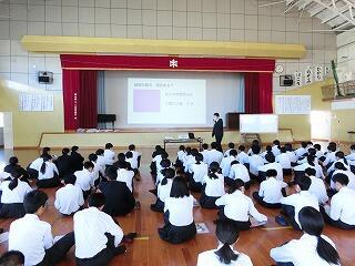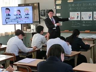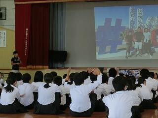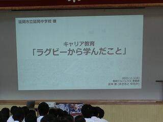 2年生で講師を招きキャリア教育講話を実施ししました。講師は、現在、延岡市でキャンプをしているラグビーチーム「静岡ブルーレヴズ」で、地域推進ユニットリーダーをされている正本さんです。