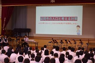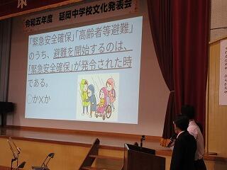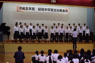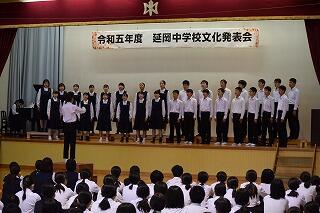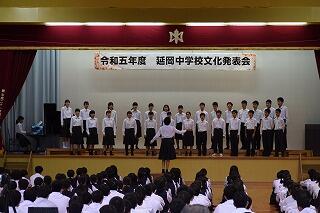 スタートは、合唱コンクールです。学年が上がる毎にレベルも上がっていきました。3年生は、後輩のよき見本となるすばらしい合唱。1・2年生に「あんな合唱を来年は自分達もしてみたい!!」と思わせる内容でした。英語暗唱・弁論は、堂々とした立派な発表でした。総合的な学習の時間の発表は、各学年とも工夫されたものになっていました。吹奏楽部演奏は、楽しい、リズミカルな演奏で、聞く人も心おどる演奏。延岡中の文化活動の成果を十分発揮できた1日になりました。