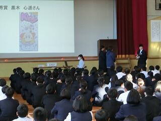 生徒集会を実施しました。生徒集会は、生徒会が自分たちで企画・運営する集会です。今回は、図書委員会の「全校しおりコンクール」の表彰を行いました。また、校則についての説明を行いました。