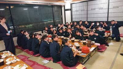 無事宿泊先に到着し、夕食をお腹いっぱいおいしくいただきました。この後お風呂に入り、22時に消灯です。明日も頑張ります。