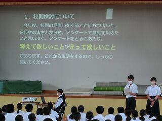 生徒集会で「校則の検討について」生徒会役員から説明がありました。