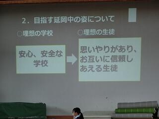 ・私たち生徒会では、この1学期に「礼儀を重んじる学校」「地域の貢献する学校」「いじめのない学校」を目指して取り組んできました。・・・また、校則に関するアンケートでは、多くの生徒の皆さんから、たくさんの意見を出していただきました。・・・2学期も全校生徒でよりよい延岡中をつくっていきましょう。