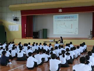 学校薬剤師の方に学年毎に薬物乱用防止教室を実施しています。発達段階に応じて講話していただいていますが、今回は1年生にタバコの影響について話していただきました。クイズ形式で楽しく正しい知識を学ぶことができました。