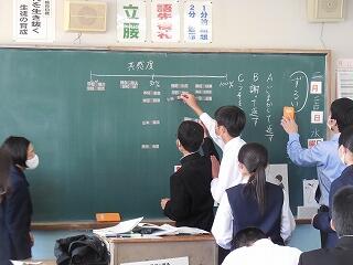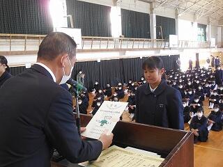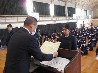 本日は木曜校時の6時間授業です。朝は全校集会があり表彰を行いました。また1時間目は2年2組で国語の研究授業(甲斐聖先生)、5時間目は1年2組で総合的な学習の時間の研究授業が行われます。