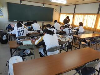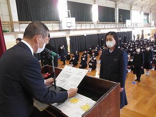 今日は月曜校時の6時間授業です。明日から後期学年末テストが始まります。そのため部活動は停止です。また、校内安全点検の日です。本日全校生徒の皆さんにユニクロ製のマスクを1人一袋(3個入)を配付いたしますのでご活用ください。