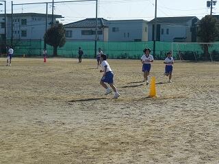 (下、1時間目の2年2組の保健体育サッカーの様子)