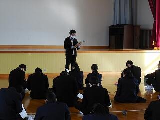 (下、午後の新入生説明会の様子、方財小学校6年生の皆さんに生徒会執行部の皆さんが説明を行いました)